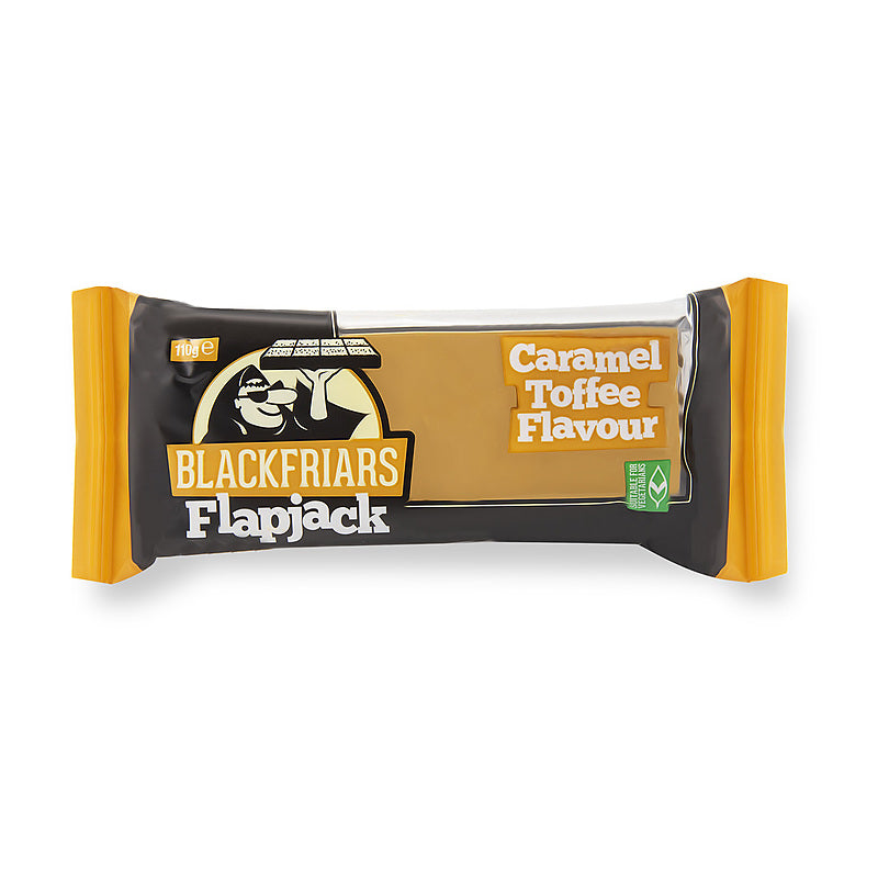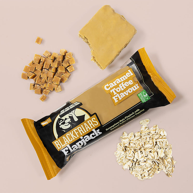 Oat flapjack with caramel toffee flavour topping. Vegetarian friendly.