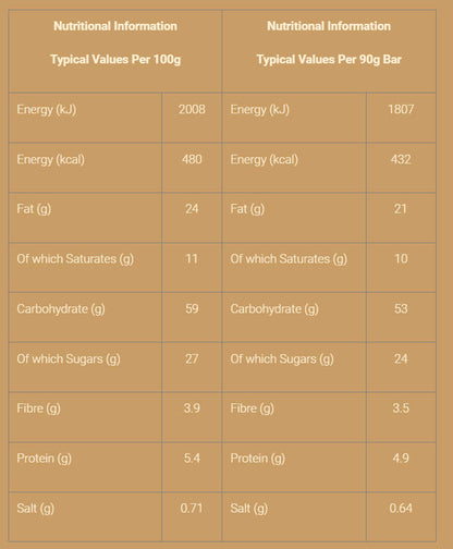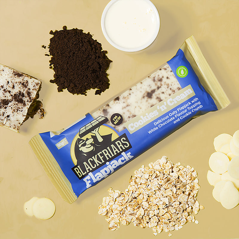 Oat flapjack with a white chocolate flavour topping and cookie crumb. Vegetarian friendly.