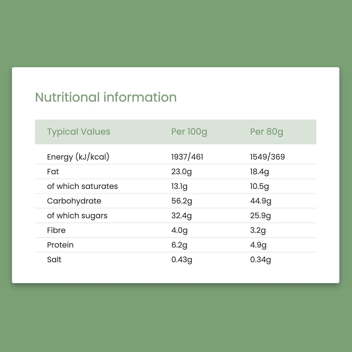 Gluten free oats (40%), golden syrup, sugar, vegetable oil (palm, rapeseed), milk powder, condensed milk, glucose syrup, cocoa powder, butteroil (milk), soya flour, flavouring, emulsifier: soya lecithin, colour: annatto, salt