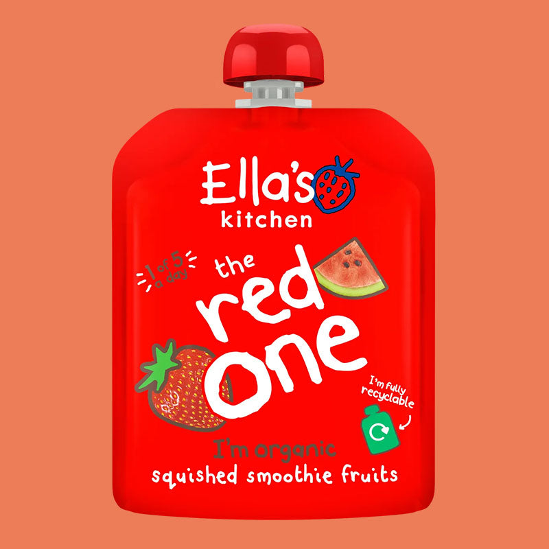 100% squished strawberries, raspberries, apples + bananas with a dash of lemon juice. Just an organic Smoothie Fruit snack, with nothing else added, not even water. It contains 1 of the 5 lovely pieces of fruit and veg recommended each day!