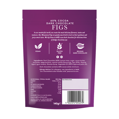 Dark Chocolate (60%) (cocoa mass, sugar, cocoa butter, emulsifier (soya lecithin), natural vanilla flavouring), Fig (39%), Glazing Agent (gum arabic), Glucose syrup, Vegetable oil (RSPO approved palm oil). Dark Chocolate contains 60% cocoa solids minimum.