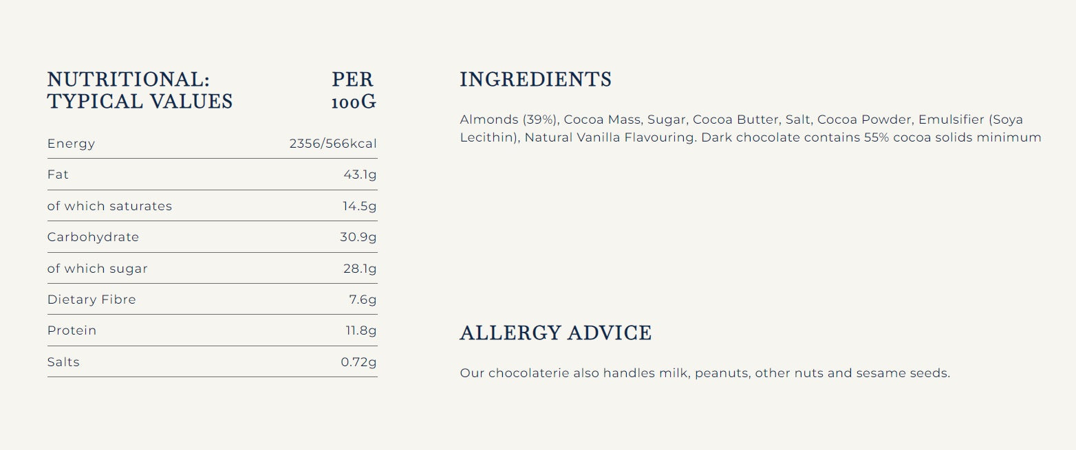 Almond (39%), cocoa mass, sugar, cocoa butter, salt, cocoa powder, Emulsifier (soya lecithin), natural vanilla flavouring. Dark Chocolate contains 60% cocoa solids minimum.