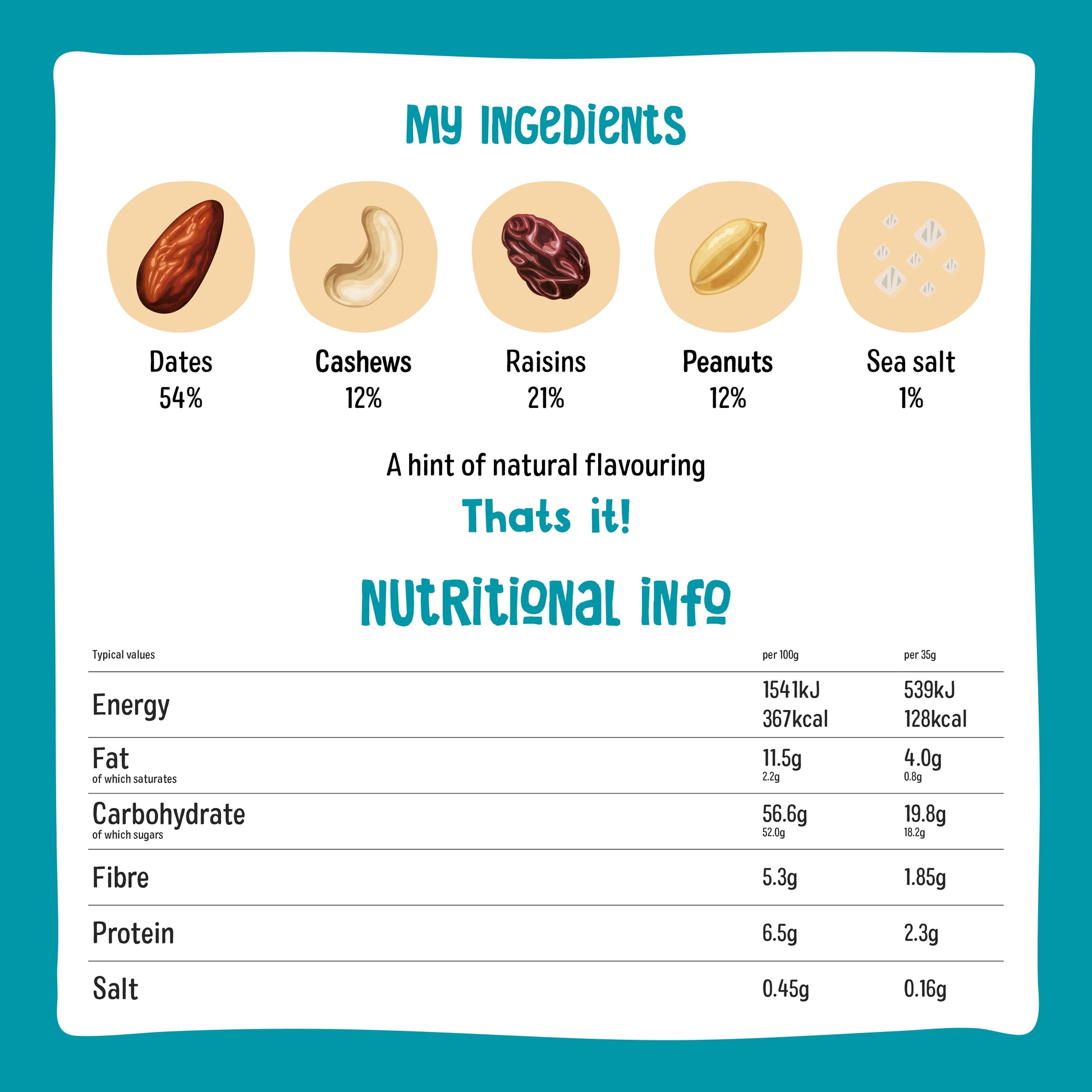 Dates (54%), Raisins (21%), Cashews(12%), Peanuts(12%), Sea Salt(0.4%) and a hint of natural flavouring. That’s it!
