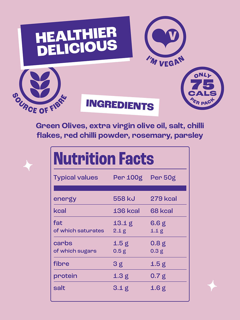Green Olives, Extra Virgin Olive Oil, Salt, Chilli Flakes, Red Chilli Powder, Rosemary, Parsley.