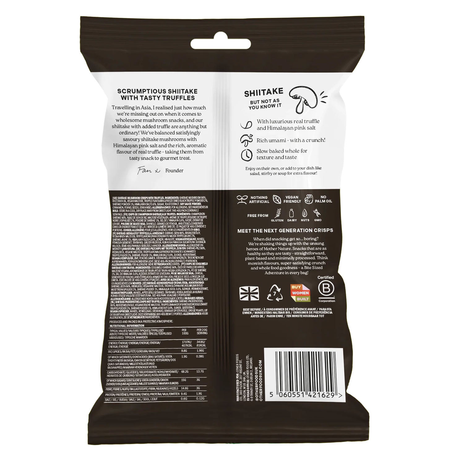 Shiitake mushroom, Rice Bran oil, Vegan Maltose, Himalayan salt, Truffle flavouring (shitake powder, salt, sugar, yeast extract, soy sauce powder, cinnamon, fennel seeds, star anise, freeze dried black truffle powder).